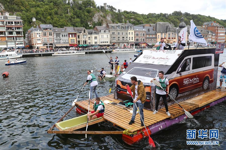 8月15日,在比利時(shí)南部小城迪南的默茲河上,人們參加“浴缸劃船節(jié)”的表演。 新華社記者 張鋮 攝