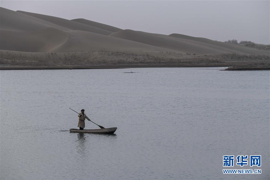 在羅布人村寨,阿木東·艾不東劃著卡盆準備去捕魚(4月11日攝)。新華社記者 趙戈 攝