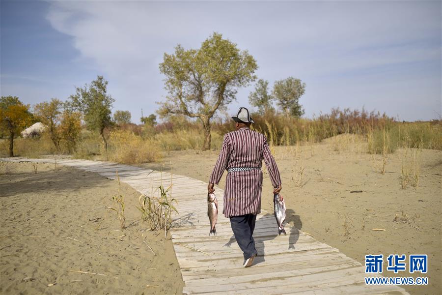 在羅布人村寨,阿木東·艾不東拎著兩條洗好的魚準備制作羅布烤魚(2018年10月16日攝)。新華社記者 趙戈 攝
