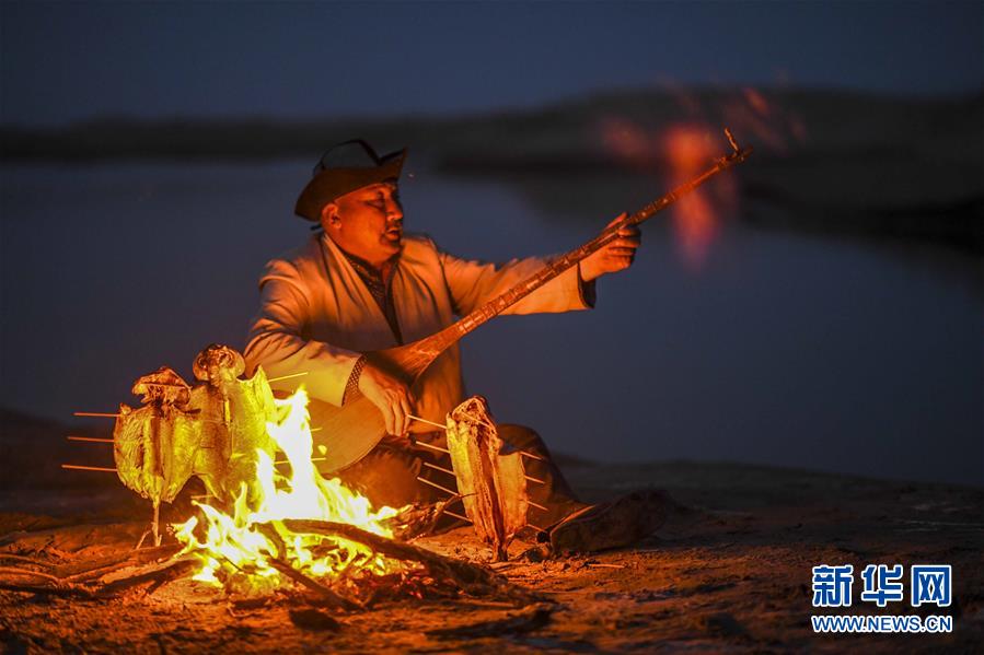在羅布人村寨,阿木東·艾不東在沙漠里的一處海子旁彈奏樂器,等待烤魚烤熟(4月11日攝)。新華社記者 趙戈 攝