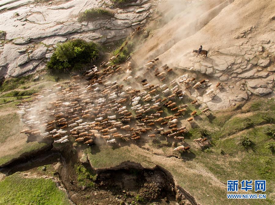新疆阿勒泰地區(qū)福??h牧民趕著牲畜向夏季牧場遷徙(6月6日無人機拍攝)。新華社記者丁磊攝