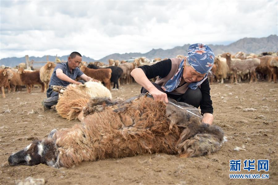 牧民趕著牛羊轉(zhuǎn)場到夏季牧場,安頓妥當(dāng)后的第一個工作就是給羊剪羊毛(6月7日攝)。新華社記者丁磊攝