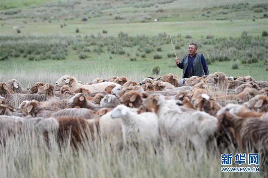 在新疆阿勒泰地區(qū)福??h牧區(qū),牧民在山坡上放羊(6月7日攝)。新華社記者丁磊攝