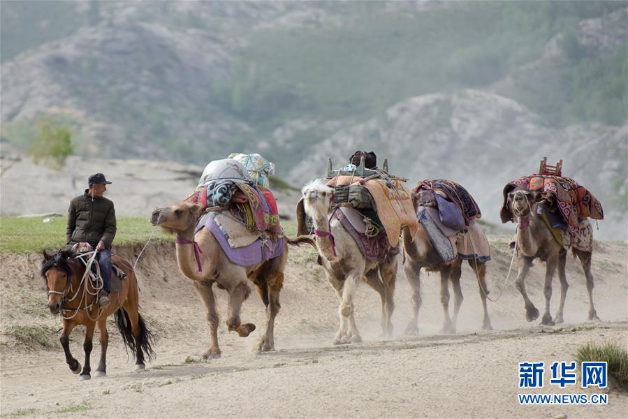 6月6日,新疆阿勒泰地區(qū)福??h牧民帶著駝隊行進在轉場途中。 新華社記者 丁磊 攝