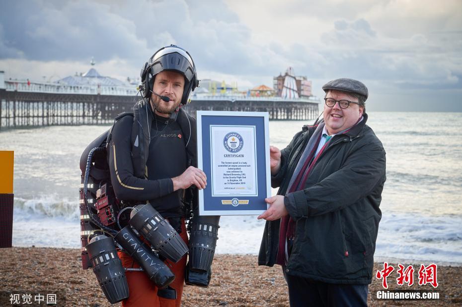 11月18日訊,英國布萊頓,英國發(fā)明家理查德·布朗寧穿著一套由身體控制、噴氣發(fā)動機驅(qū)動、風力導向的飛行服,以高達每小時85.06英里(約137公里)的飛行速度,打破了自己創(chuàng)下的噴氣式飛行服速度的吉尼斯世界紀錄。圖為工作人員為理查德·布朗寧頒獎。圖片來源:視覺中國