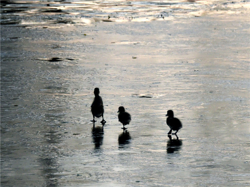 2019年12月2日,北京玉淵潭公園湖畔,三只野鴨寶寶在冰面上行走、湖中游弋,呆萌可愛。