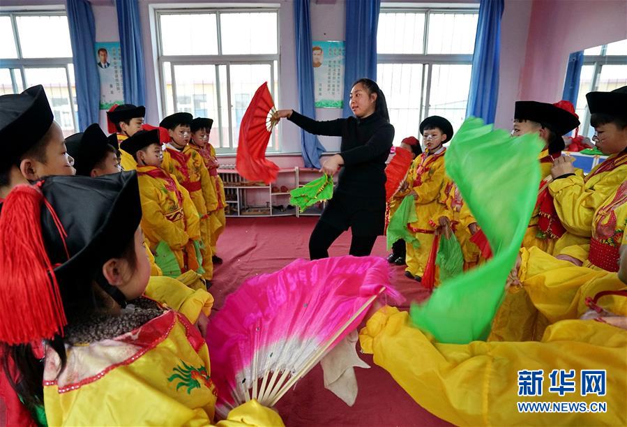 12月19日,河北省灤州市小閆營小學教師在為學生示范地秧歌動作要領。新華社記者 牟宇 攝
