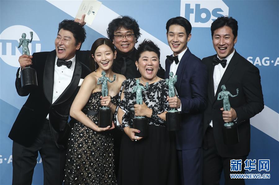 1月19日,在美國(guó)洛杉磯,韓國(guó)黑色喜劇片《寄生蟲(chóng)》主創(chuàng)人員展示獎(jiǎng)杯。 新華社記者 李穎 攝