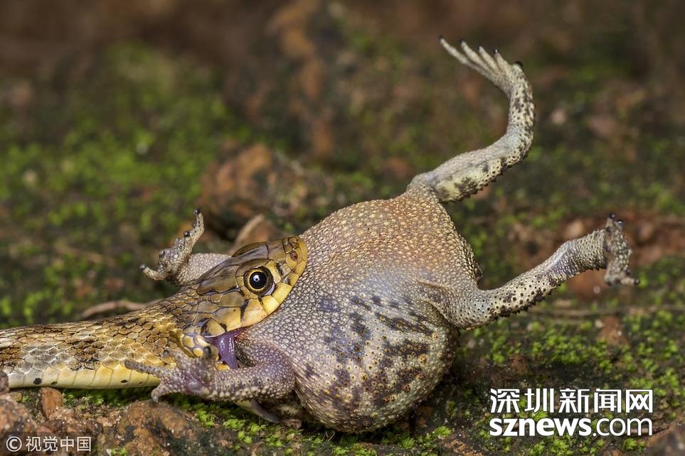 印度加爾各答B(yǎng)olpar,業(yè)余攝影師Agniswar Ghosal在Bolpar散步時(shí)拍到蛇大口吞咽蟾蜍的震撼場(chǎng)景。