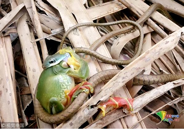 印度喀拉拉邦,一條大眼樹蛇非常貪婪地一口吞下了一只長(zhǎng)約10厘米的青蛙,只剩青蛙兩只腿在外掙扎。28歲的捕蛇人Sujith VP拍下這一過(guò)程。