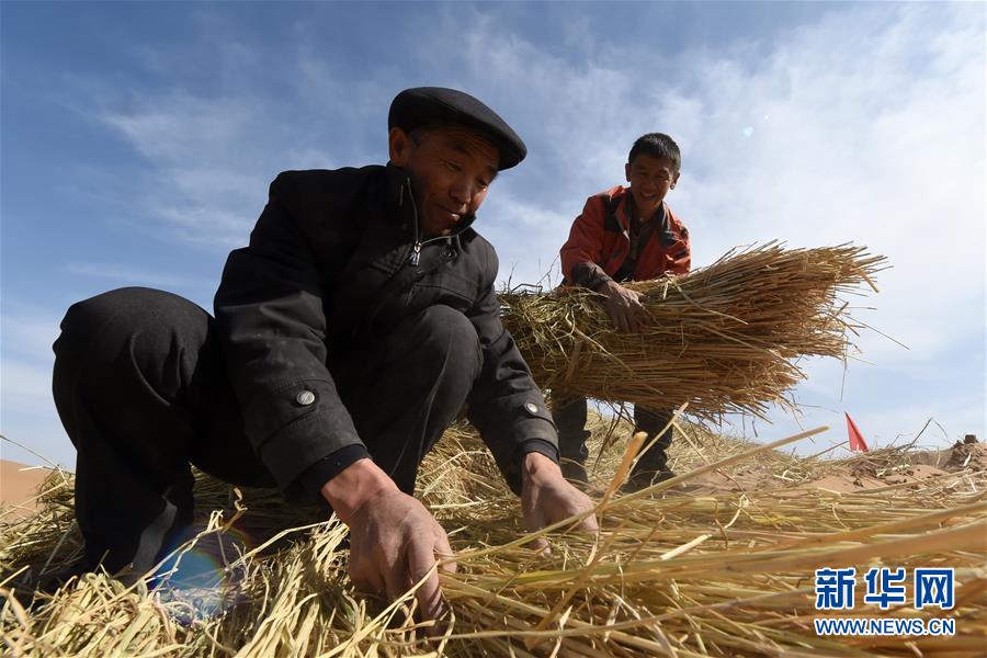 3月5日,在古浪縣北部沙區(qū)旱麻崗治沙點(diǎn),八步沙林場第二代治沙人郭萬剛(左)和第三代治沙人郭璽扎草方格壓沙。初春時(shí)節(jié),在騰格里沙漠南緣的甘肅省武威市古浪縣,當(dāng)?shù)馗刹柯毠ぜ鞍瞬缴沉謭鲋紊橙斯餐诳h城北部沙區(qū)旱麻崗治沙點(diǎn)開展春季治沙勞動(dòng)。新華社記者 范培珅 攝