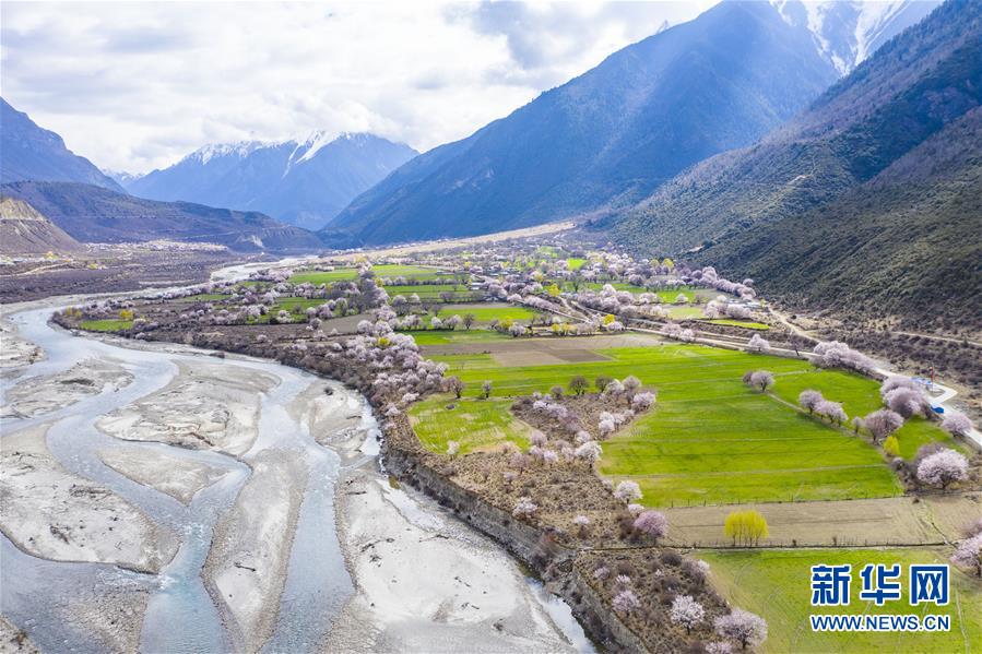 西藏林芝市波密縣境內(nèi)桃花盛開的田園風光(無人機照片,3月26日攝)。新華社記者 普布扎西 攝