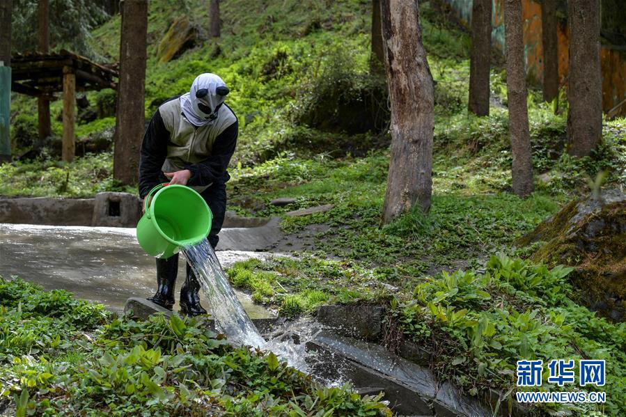 4月14日,中國大熊貓保護(hù)研究中心核桃坪基地的飼養(yǎng)員周季秋身著涂抹了稀釋后大熊貓尿液的“熊貓偽裝服”,在大熊貓活動(dòng)場內(nèi)打掃衛(wèi)生。新華社記者張超群攝