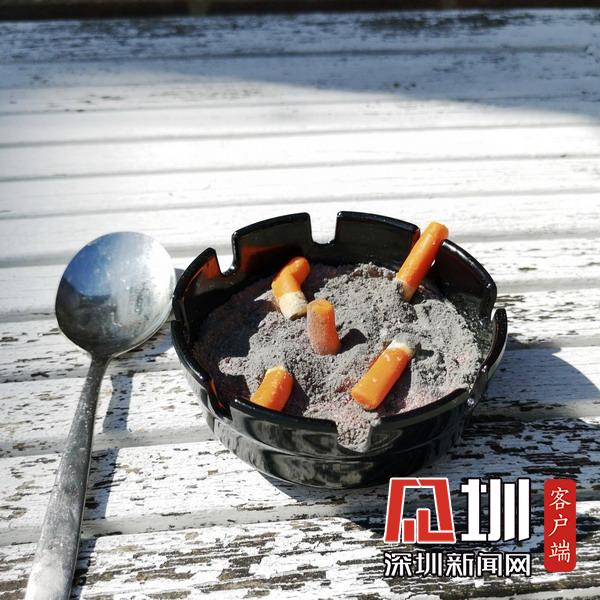 “煙灰缸”奶酪。煙灰缸內放置著瓦尼拉蔓越莓慕斯,巧克力還有蛋白粉末制作的煙頭煙灰。