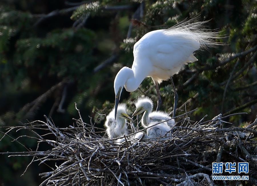 在象山森林公園,白鷺和幼鳥在一起(4月26日攝)。近日,在江西省南昌市新建區(qū)象山森林公園內(nèi),已安家筑巢的大批鷺鳥正陸續(xù)孵化后代,一派生機勃勃的景象。新華社記者彭昭之攝
