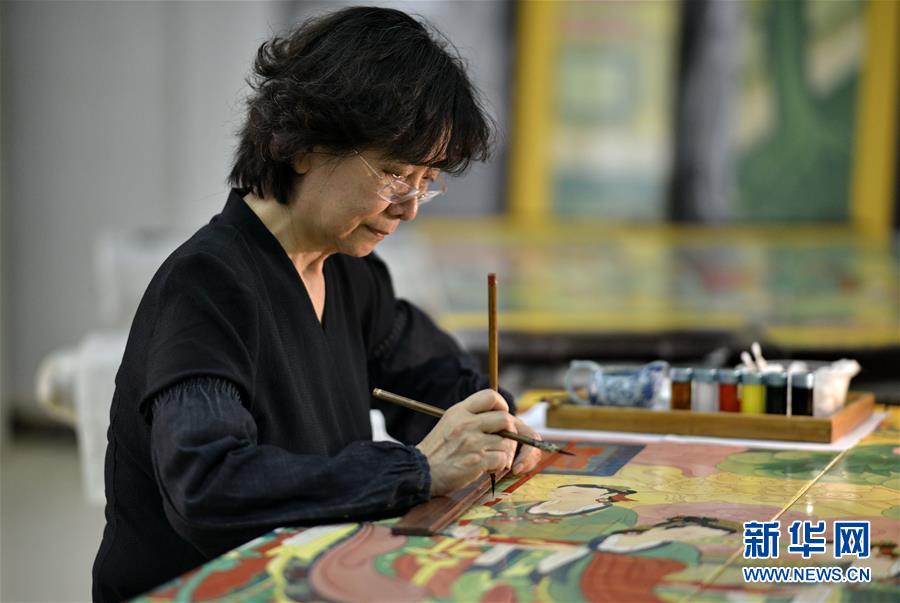 5月4日,工藝美術(shù)大師胡昕在進(jìn)行屏風(fēng)畫面最后的檢視修補(bǔ)。