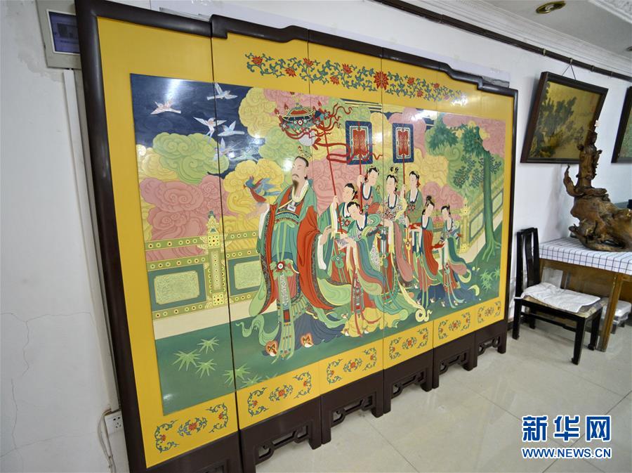 5月4日拍攝的采用金漆鑲嵌彩繪工藝?yán)L制完成的承恩寺壁畫屏風(fēng)《帝后放飛圖》。新華社記者 李欣 攝