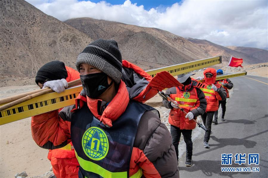 在西藏定日縣曲當(dāng)鄉(xiāng)境內(nèi),國測一大隊隊員前往水準(zhǔn)測量點(4月18日攝)。水準(zhǔn)測量是一種利用提供水平視線的儀器(如水準(zhǔn)儀、水準(zhǔn)標(biāo)尺),測定地面不同點之間的高差,并以此推算高度的一種方法,是經(jīng)典大地測量的重要技術(shù)之一。在目前正在進行的2020珠峰高程測量中,部分國測一大隊隊員承擔(dān)了水準(zhǔn)測量的任務(wù)。新華社記者孫非攝