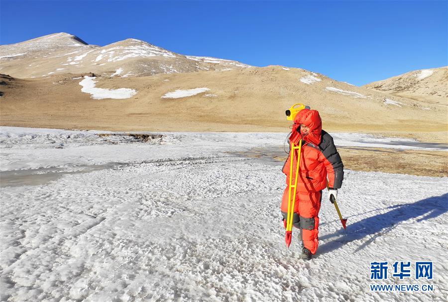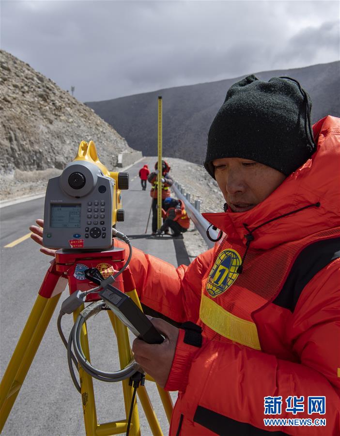 國測一大隊隊員霍申申在西藏定日縣扎西宗鄉(xiāng)境內(nèi)進行水準(zhǔn)測量(4月4日攝)。水準(zhǔn)測量是一種利用提供水平視線的儀器(如水準(zhǔn)儀、水準(zhǔn)標(biāo)尺),測定地面不同點之間的高差,并以此推算高度的一種方法,是經(jīng)典大地測量的重要技術(shù)之一。在目前正在進行的2020珠峰高程測量中,部分國測一大隊隊員承擔(dān)了水準(zhǔn)測量的任務(wù)。新華社發(fā)(楊明攝)