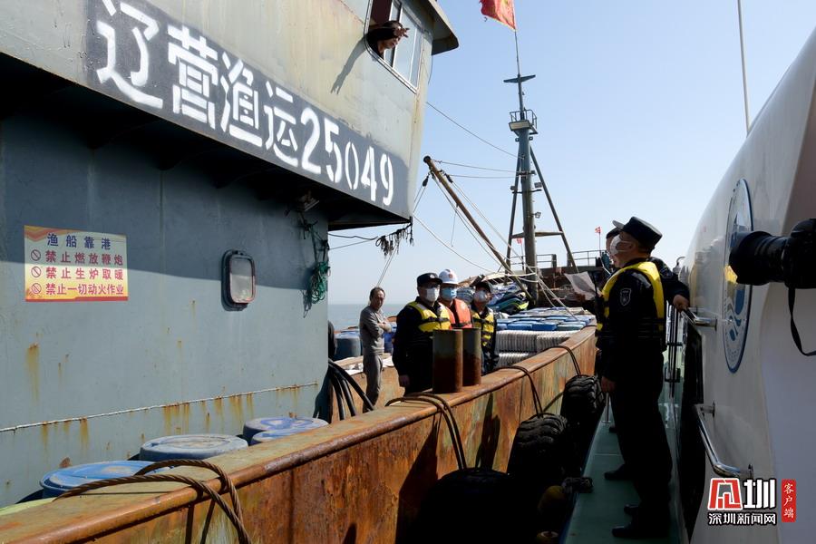 2020年5月6日,山東省榮成市石島管理區(qū)石島灣海域,榮成市漁政部門執(zhí)法人員對一運輸船進行檢查。