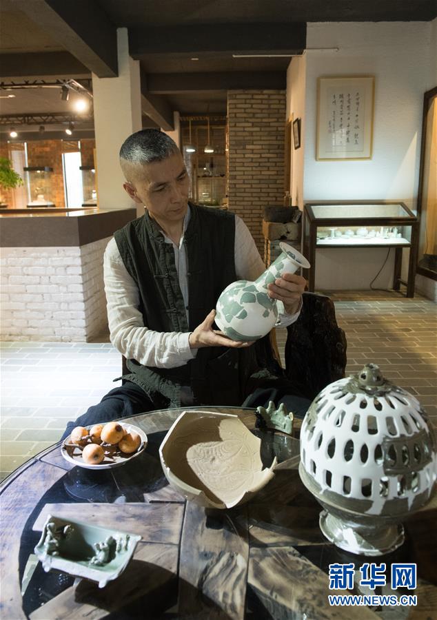 5月8日,項(xiàng)宏金在龍泉青瓷裝飾紋樣研究所查看自己收藏的一些古瓷器。1965年出生的項(xiàng)宏金,被浙江龍泉年輕一代瓷人稱(chēng)為“項(xiàng)哥”,他從20世紀(jì)90年代開(kāi)始收集龍泉青瓷標(biāo)本,研究青瓷紋樣。2014年出版著作《龍泉青瓷裝飾紋樣》,次年開(kāi)設(shè)龍泉青瓷裝飾紋樣研究所,將自己收藏的千余件標(biāo)本跟瓷器愛(ài)好者、創(chuàng)作者免費(fèi)分享。新華社記者翁忻旸攝