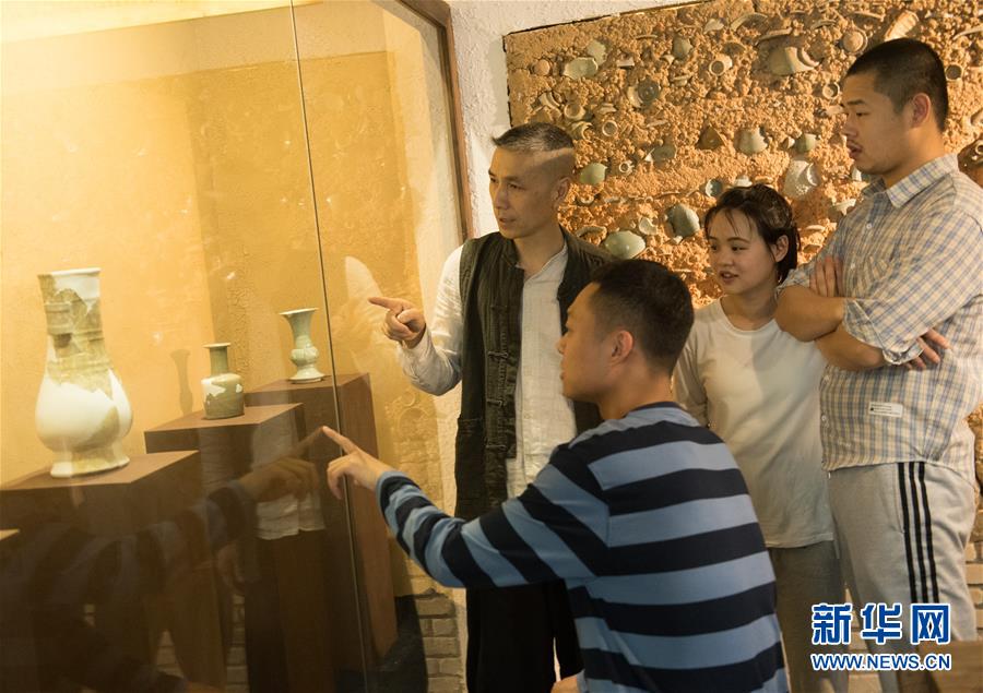5月8日,項(xiàng)宏金(左一)在龍泉青瓷裝飾紋樣研究所向來訪的年輕瓷人介紹一件貫耳瓶。1965年出生的項(xiàng)宏金,被浙江龍泉年輕一代瓷人稱為“項(xiàng)哥”,他從20世紀(jì)90年代開始收集龍泉青瓷標(biāo)本,研究青瓷紋樣。2014年出版著作《龍泉青瓷裝飾紋樣》,次年開設(shè)龍泉青瓷裝飾紋樣研究所,將自己收藏的千余件標(biāo)本跟瓷器愛好者、創(chuàng)作者免費(fèi)分享。新華社記者翁忻旸攝
