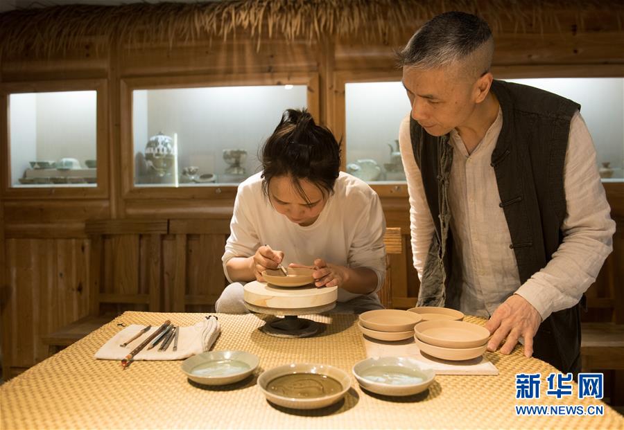 5月8日,“90后”瓷人湯佳(左)在龍泉青瓷裝飾紋樣研究所對著項宏金收藏的古瓷器刻劃魚紋盤。1965年出生的項宏金,被浙江龍泉年輕一代瓷人稱為“項哥”,他從20世紀90年代開始收集龍泉青瓷標本,研究青瓷紋樣。2014年出版著作《龍泉青瓷裝飾紋樣》,次年開設龍泉青瓷裝飾紋樣研究所,將自己收藏的千余件標本跟瓷器愛好者、創(chuàng)作者免費分享。新華社記者翁忻旸攝