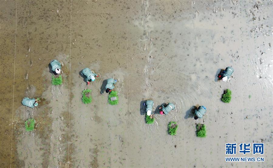 這是5月22日拍攝的農(nóng)民在寧安市渤海鎮(zhèn)上官地村一塊稻田中插秧(無人機照片)。新華社記者王建威攝