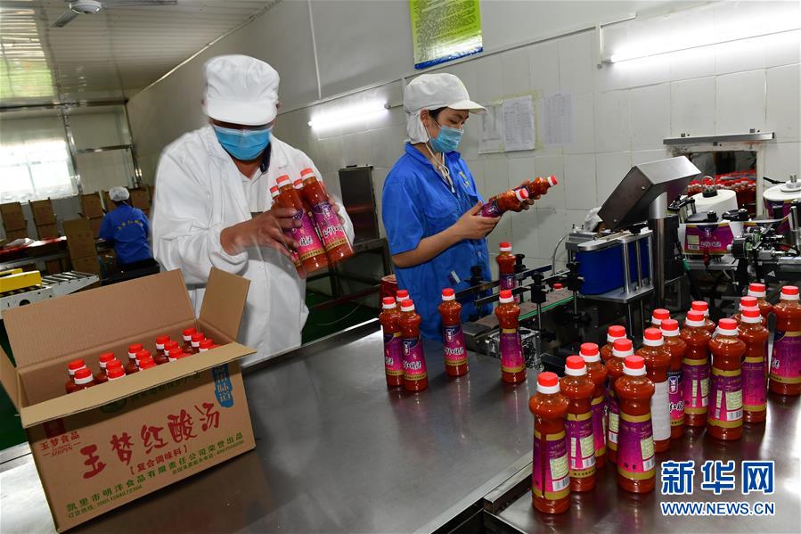 5月26日,在貴州省黔東南苗族侗族自治州麻江縣明洋食品公司生產(chǎn)車(chē)間,工人將制作好的古法酸湯裝箱。新華社記者楊楹攝