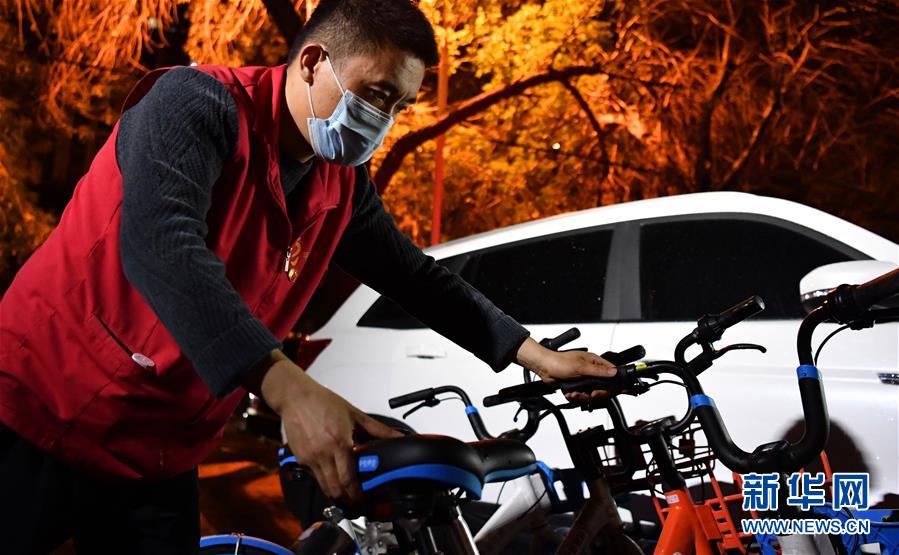 楊龍明將搬出小區(qū)的共享單車(chē)擺放整齊(6月1日攝)。新華社記者李然攝。