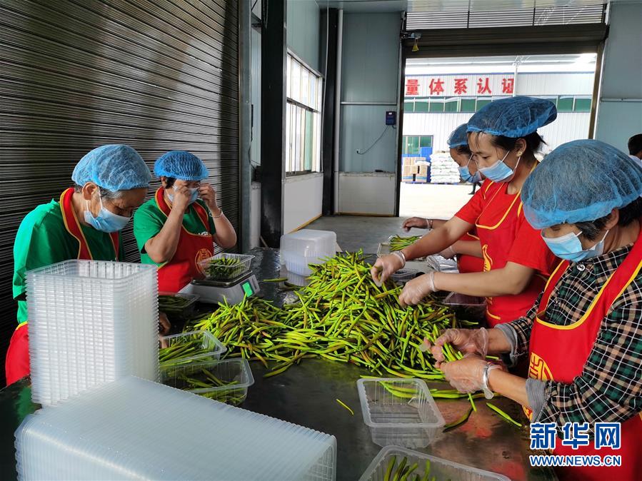 建檔立卡貧困戶在車間里加工黃花菜(5月29日攝)。新華社記者謝櫻攝。