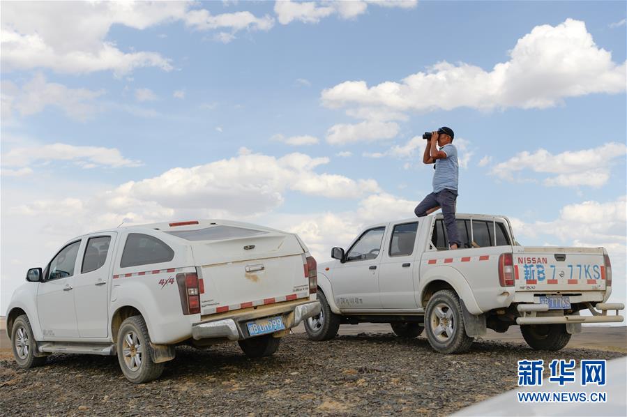 在新疆卡拉麥里山有蹄類野生動物自然保護區(qū),管護員阿達比亞特在觀察遠處水源地蓄水情況(6月3日攝)。新華社記者丁磊攝。