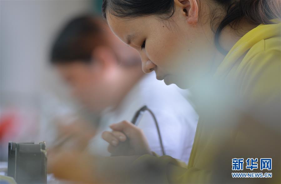 6月4日,工人在永州市新田縣一處易地搬遷集中安置點的扶貧車間里加工電器零部件。新華社記者趙眾志攝。