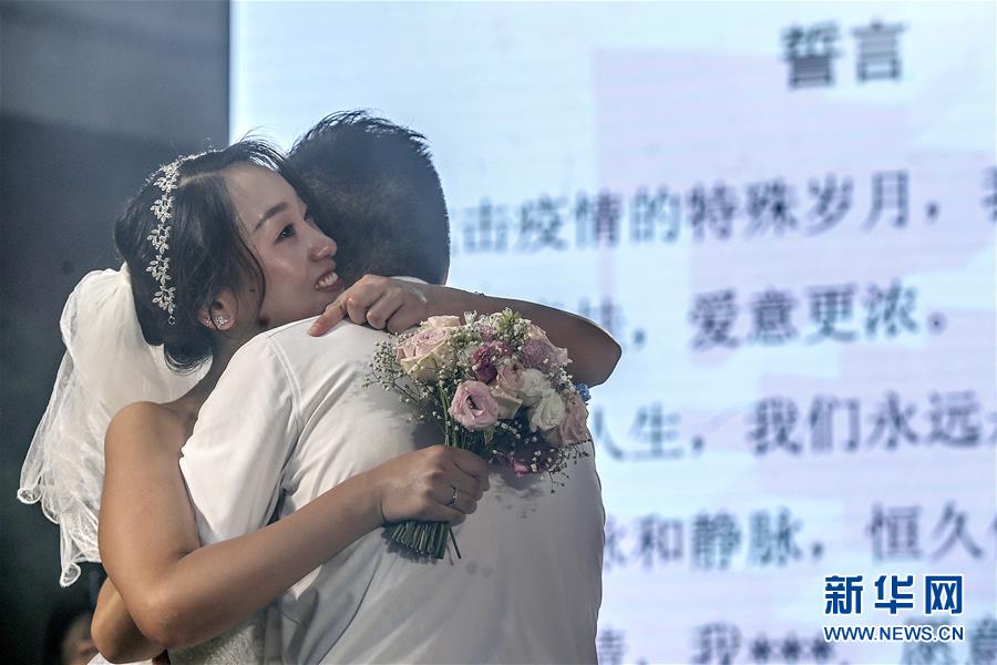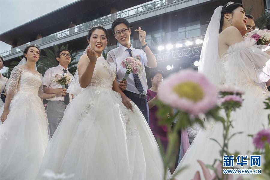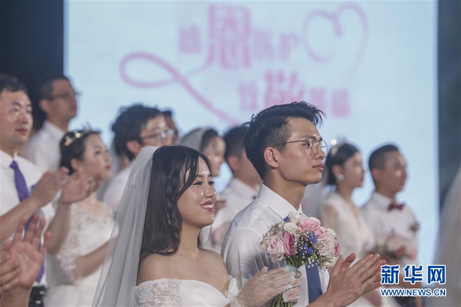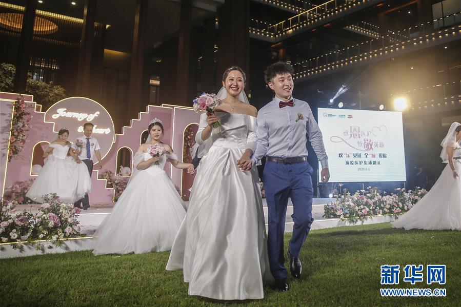 6月6日,新人在海南博鰲樂城國際醫(yī)療旅游先行區(qū)參加集體婚禮。當(dāng)日,來自北京、武漢、廣州等地的30對新人在海南博鰲樂城國際醫(yī)療旅游先行區(qū)參加了一場集體婚禮。參加婚禮的部分新人此前因參加湖北的抗疫工作而推遲了婚期。 新華社記者 張麗蕓 攝