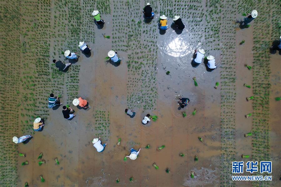 6月7日,孩子和家長(zhǎng)們體驗(yàn)稻田插秧(無(wú)人機(jī)照片)。新華社記者徐昱攝