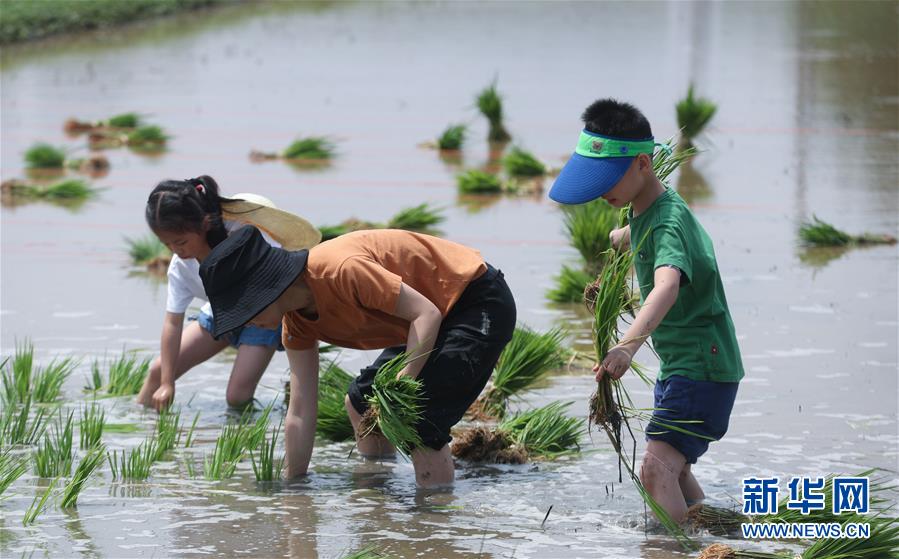 6月7日,孩子和家長(zhǎng)在稻田里插秧。新華社記者徐昱攝