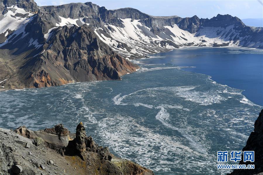 這是6月12日拍攝的長白山天池。近日,長白山天池冰層逐漸消融,迎來“開冰季”。新華社記者 林宏 攝