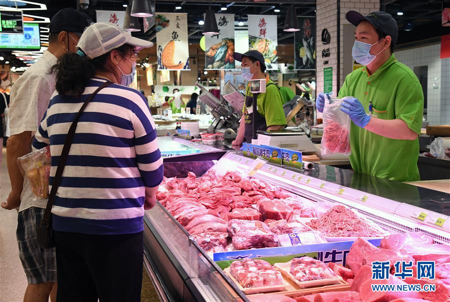 6月14日,在北京市海淀區(qū)的超市發(fā)雙榆樹店,市民在挑選鮮肉。 新華社記者 任超 攝