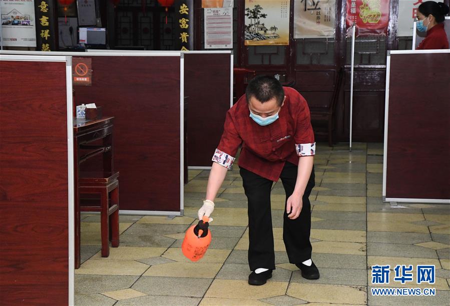 6月17日,在位于北京市海淀區(qū)的海碗居增光路店,工作人員對地面進(jìn)行消毒。新華社記者 任超 攝