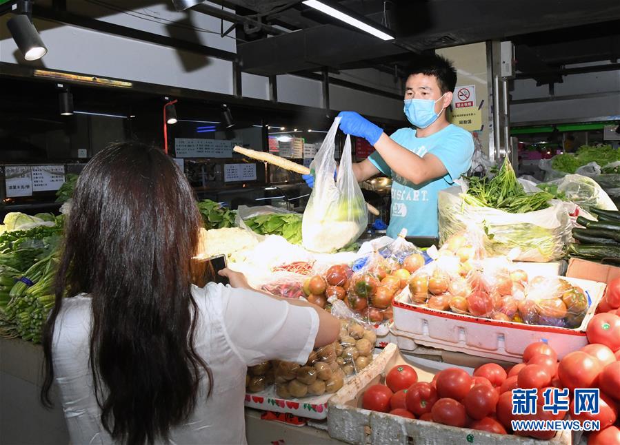 6月17日,在位于北京市海淀區(qū)的增光鴻運市場,市民(左)在購買蔬菜。新華社記者 任超 攝