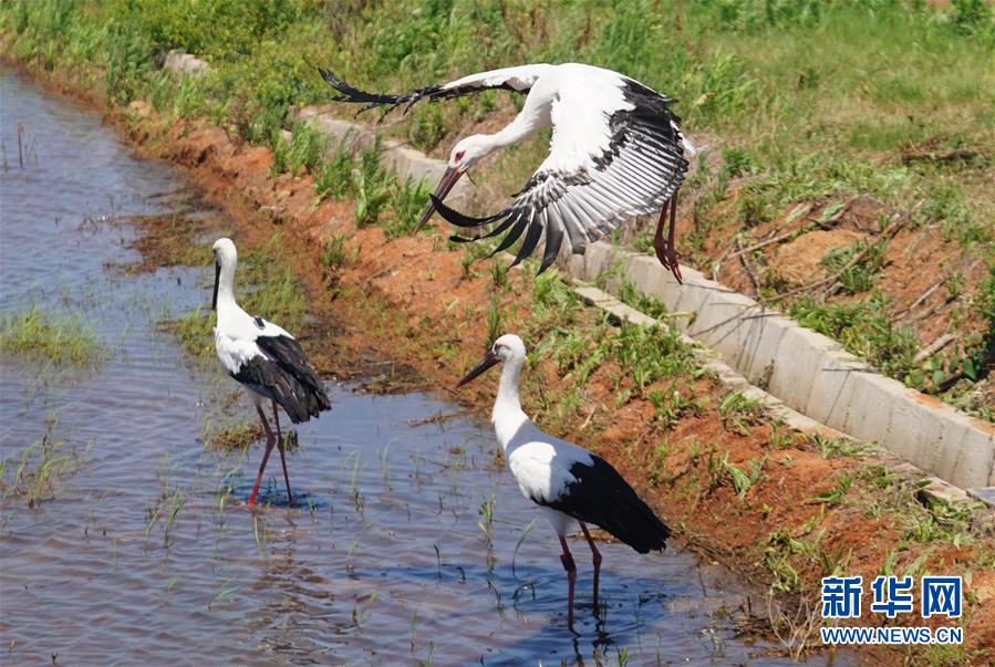 三只東方白鸛鄱陽(yáng)湖畔放歸自然