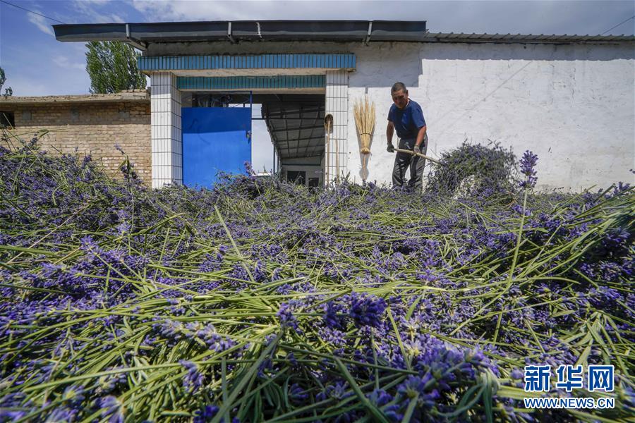 霍城縣蘆草溝鎮(zhèn)四宮村的村民馬英國在家門口晾曬薰衣草干花(6月16日攝)。新華社記者 趙戈 攝