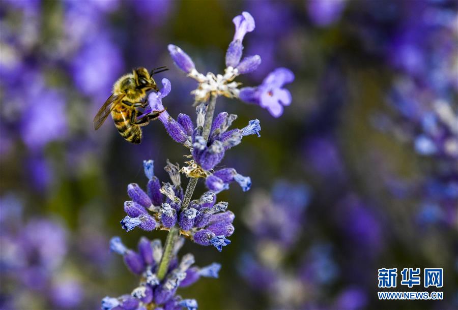 蜜蜂在霍城縣蘆草溝鎮(zhèn)四宮村的一處薰衣草花田里采蜜(6月16日攝)。新華社記者 趙戈 攝