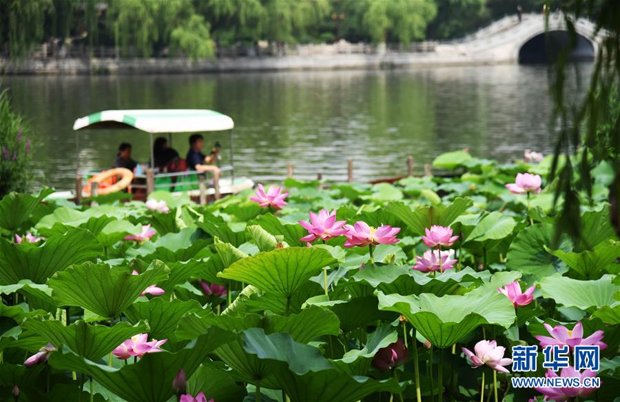 6月19日,市民在大明湖畔欣賞荷花。近日,山東濟(jì)南大明湖的荷花陸續(xù)綻放,吸引游客前來觀賞。新華社記者 王凱 攝