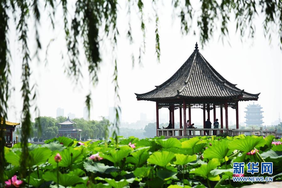 6月19日,市民在大明湖畔欣賞荷花。近日,山東濟南大明湖的荷花陸續(xù)綻放,吸引游客前來觀賞。新華社記者 王凱 攝