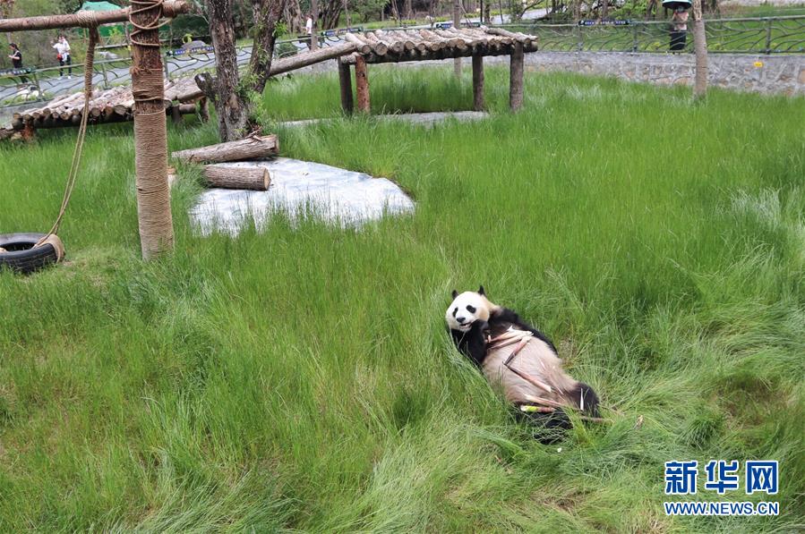 在位于四川省阿壩藏族羌族自治州的九寨溝大熊貓園,大熊貓“新新”在玩耍(6月19日攝)。新華社記者沈伯韓攝