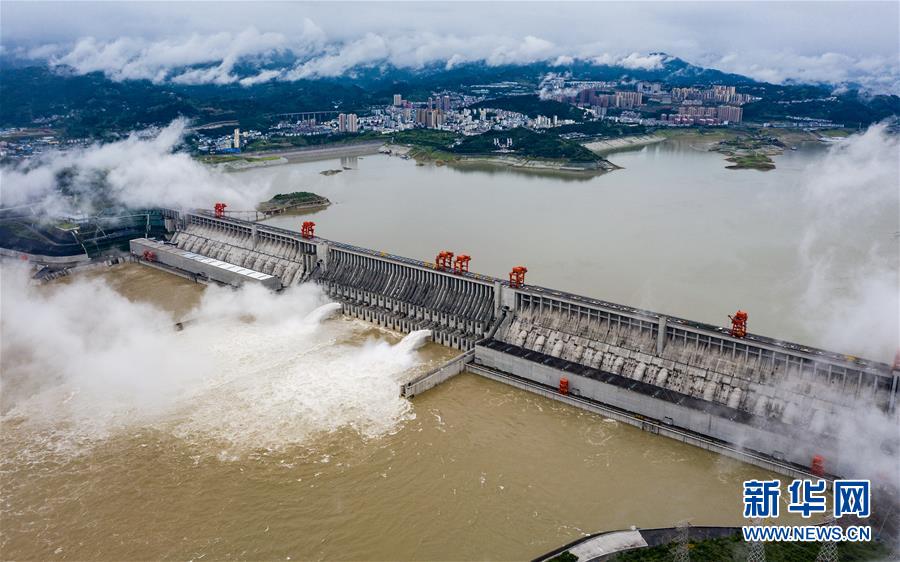 6月29日,三峽樞紐開啟泄洪孔泄洪(無人機照片)。受長江中上游強降雨影響,進入三峽水庫的水量持續(xù)增多。為騰出一定庫容迎接近期可能到來的洪水,三峽樞紐于6月29日上午開啟兩個泄洪孔,加大下泄流量。這是三峽樞紐今年首次泄洪。28日14時,三峽水庫入庫流量達4萬立方米/秒,是27日14時的兩倍。為應(yīng)對此輪來水,長江防總要求將三峽水庫下泄流量上調(diào)至日均3.5萬立方米/秒。新華社發(fā)(鄭家裕攝)