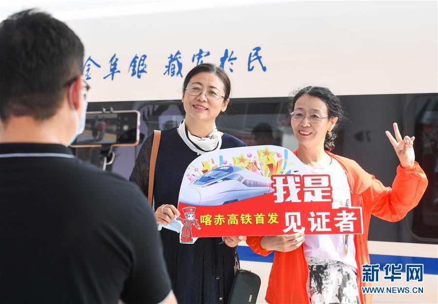 6月30日,乘客在赤峰站與G8382次“和諧號”動車組列車合影留念。新華社記者彭源攝
