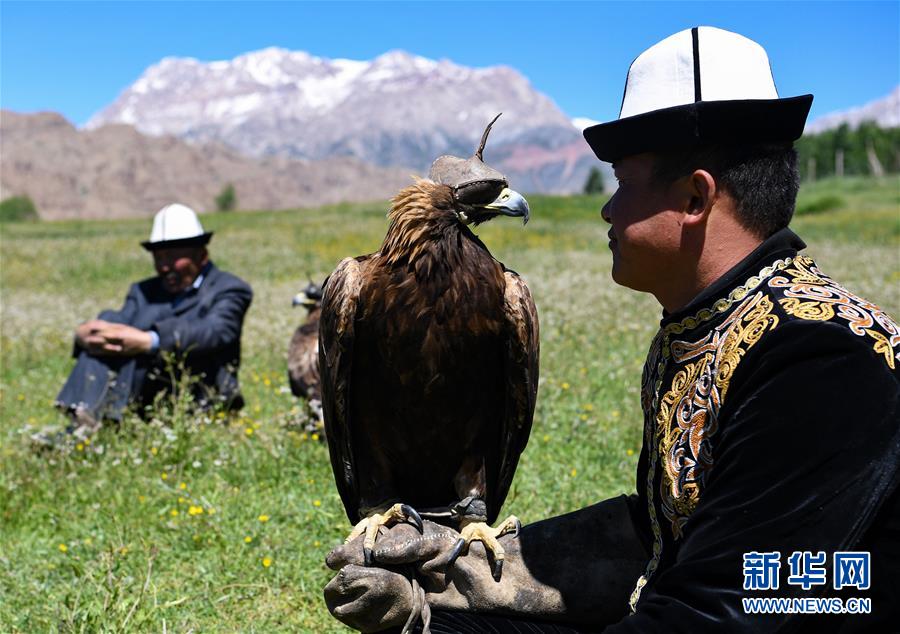 6月29日,庫爾馬西·胡特曼(右)和他的徒弟們展示獵鷹。新華社記者宋彥樺攝