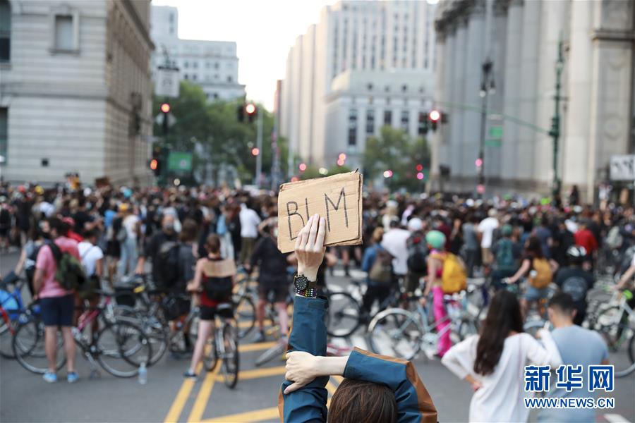 6月30日,一名抗議者在美國(guó)紐約市政廳附近手舉寫有“黑人的命也是命”縮寫的標(biāo)語參加抗議活動(dòng)。由美國(guó)明尼蘇達(dá)州明尼阿波利斯市非裔男子弗洛伊德遭白人警察暴力執(zhí)法而死一事引發(fā)的各種抗議活動(dòng)仍在紐約持續(xù)進(jìn)行。新華社記者王迎攝